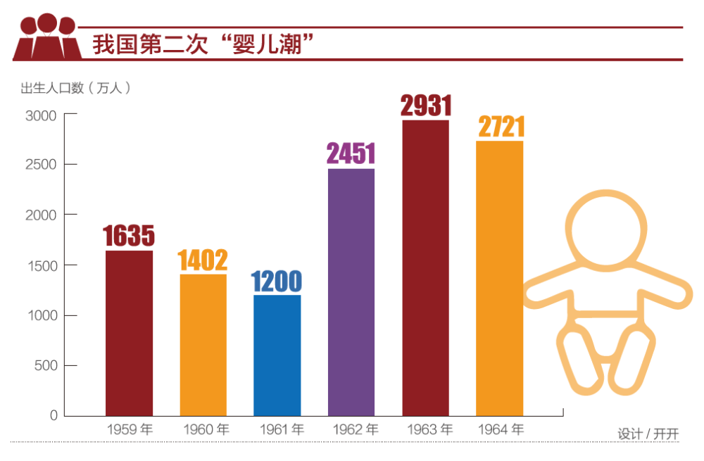 大家都知道,上世纪三年自然灾害结束后,我国迎来了第二次“婴儿潮”。三年自然灾害的第一年、1959年我国出生人口是1635万,1960年是1402万,1961年下降到最低,是1200万。紧接着就是“婴儿潮”,1962年是2451万,1963年达到峰值2931万,1964年是2721万。